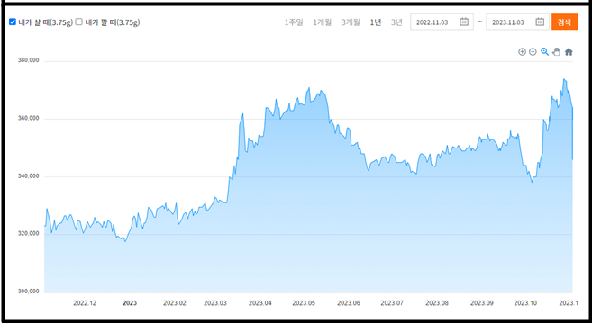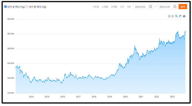 최근에는 중동 이스라엘과 팔레스타인의 긴장 상태가 영향을 주어 안전 자산에 대한 수요가 상승함에 따라 금 시세가 우상향을 보이는 것으로 나타났습니다.