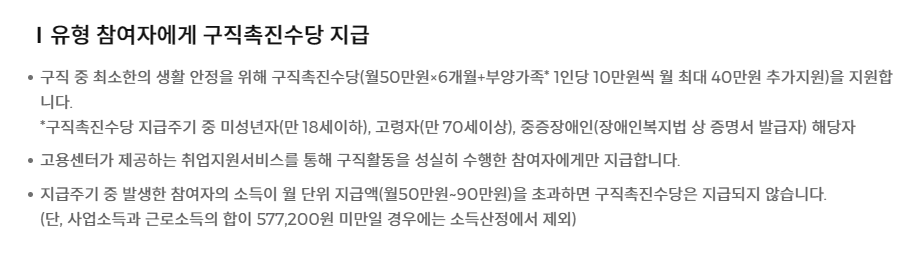 국민취업지원제도는 취업 취약계층으로 인정되는 분들이 지원받을 수 있는 취업지원서비스입니다. 해당되시는 분은 구직자 촉진수당 월50만원을 6개월간 받으실 수 있으며 부양가족이 있다면 추가 지원 10만 원을 더 받으실 수 있습니다.
