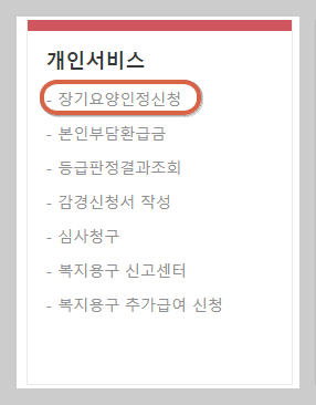 위 링크를 타고 접속하셔서 왼쪽 아래 개인 서비스 > 장기요양인정신청으로 로그인하시기 바랍니다. 장기요양신청을 하시려면 공단 홈페이지에 로그인을 해야 하며 회원가입 및 공인인증서가 필요합니다.